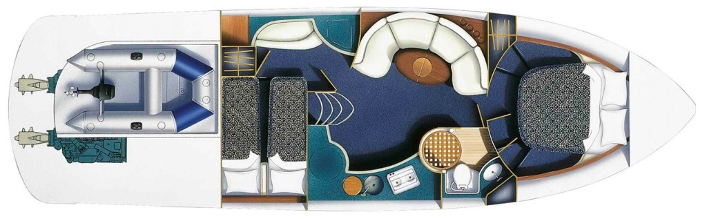 Cockpit: Helm seat; Navigator L-shaped seating; Table and U-shaped seating; Wetbar; Sunpad and stowage locker