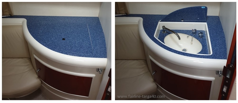 - Dinner plate storage. Fooled many a new owner but there is a cut-out recess in the corner of the worktop next to the electrical control panel. The worktop lid lifts out to reveal moulded sections for plates and bowls. Unfortunately, the level of the worktop tilts slightly to the stern so any stray water from washing up follows gravity into the recess!